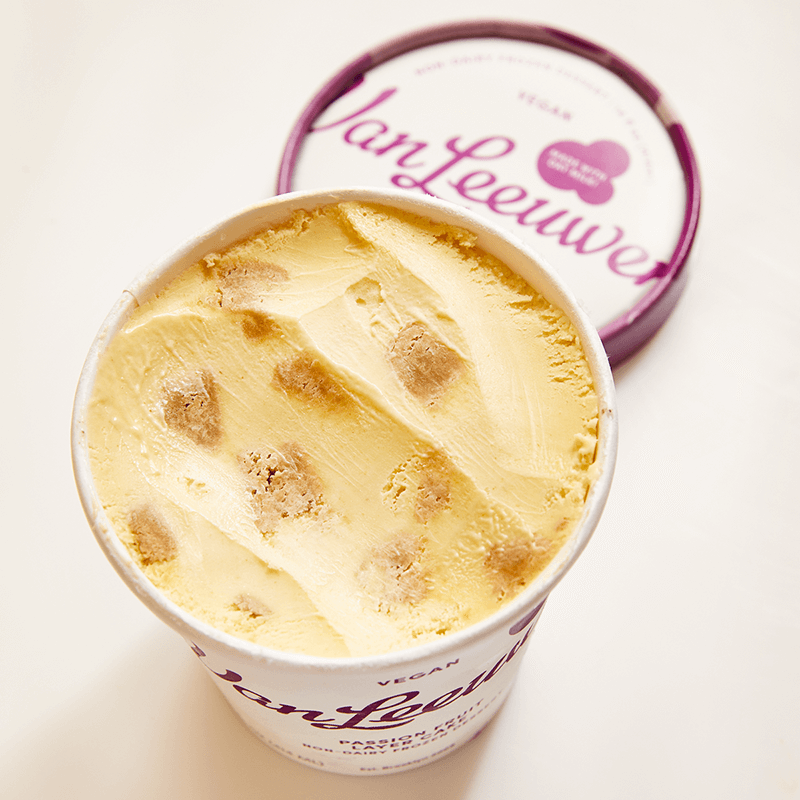 Nothing makes us happier than this Vegan Passion Fruit Layer Cake Ice Cream. It starts with our oat milk ice cream. Then we blend in tart passion fruit. Then we layer in pieces of vegan cake. Then we realize the name says all that, just shorter. Then we apologize for eye strain.